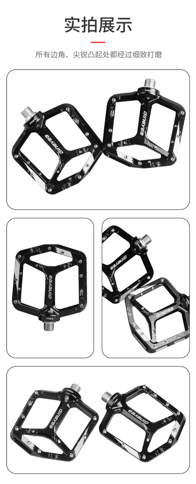 產品描述:景曄新款C6系列外觀設計比較個性化,造型設計相同,采用嵌套軸心的一個設計,所有邊角尖銳凸起除都經過細致打磨,鋁合金CNC本體,珞鉬鋼軸心,騎行更省力,采用大軸承+襯套的一個設計,尺寸分大中小,大號用于速降,中號用于CX,林道,泵道,小號用于童車